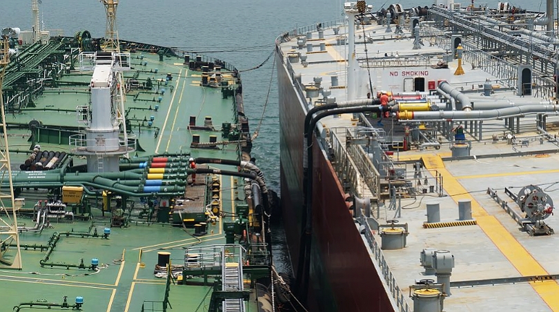 ▲ SK트레이딩인터내셔널이 임차한 선박(왼쪽)이 해상블렌딩을 위한 중유를 다른 유조선에서 수급 받고 있다.