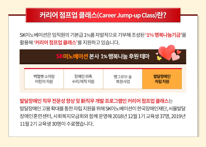 SK이노베이션은 구성원들이 기본급 1%를 자발적으로 기부해 조성한 ‘1% 행복나눔’ 기금으로 지난 2018년부터 커리어 점프업 클래스를 지원하고 있으며 한국장애인재단, 한국장애인고용공단, 사회복지공동모금회와 함께 운영하고 있다.