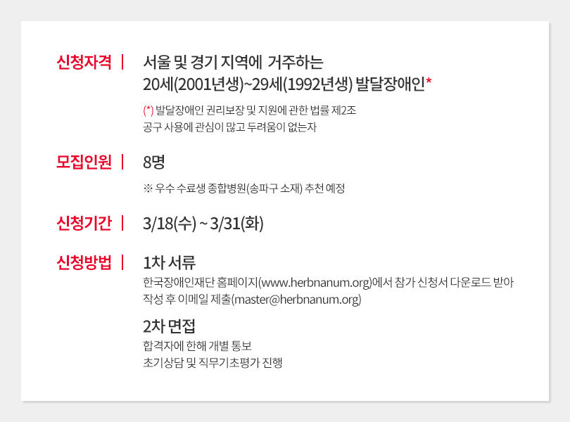 서류전형 합격자에 한해 2차 면접 심사가 진행되며, 최종 선정된 8명은 4월부터 5월까지 약 2개월간 경기북부장애인가족지원센터에서 전문 직무 교육을 받게 된다. 이후 우수 수료생은 서울시 송파구 소재의 병원에 보조기기 사후관리자로 추천될 예정이다.