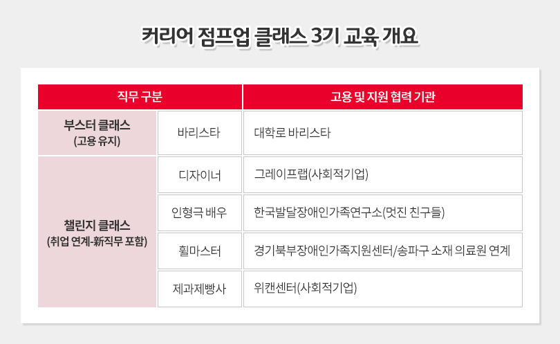 커리어 점프업 클래스 3기에서는 학령기 이후 발달장애인의 직무 전문성 향상과 고용을 통한 사회적가치 창출을 목적으로 총 5개의 직무 교육이 진행된다. 또한, 발달장애인 고용 의사가 있는 사업장과 연계해 직무 교육과 함께 직장 내 적응을 돕기 위한 사회성 향상 교육을 지원한다.