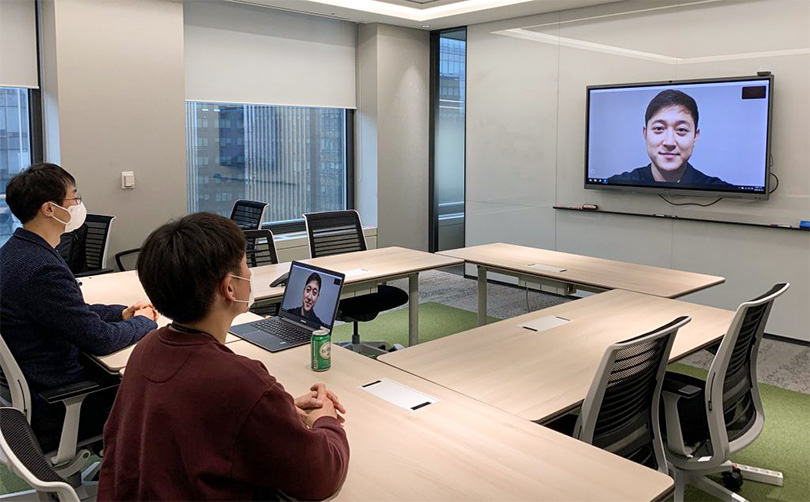▲ 화상 면접을 위해 SK서린빌딩에서 화상회의 시스템을 테스트하고 있는 모습