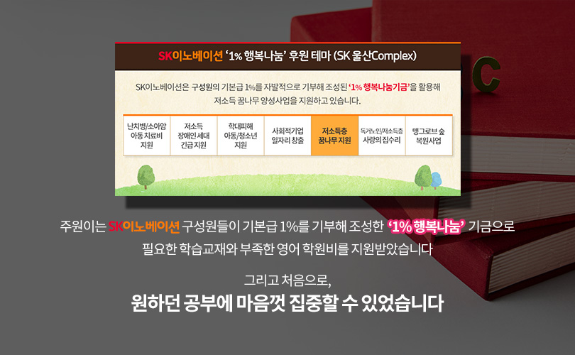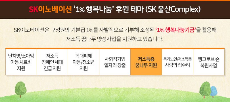 SK이노베이션의 주력 생산기지인 SK 울산Complex는 구성원들이 자발적으로 기본급 1%를 기부해 조성한 ‘1% 행복나눔’ 기금을 통해 ‘저소득 꿈나무 양성사업’을 지원하고 있다.