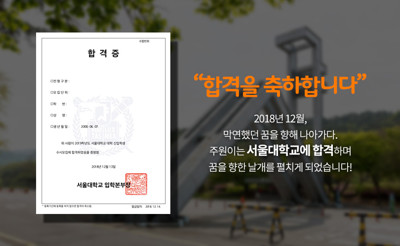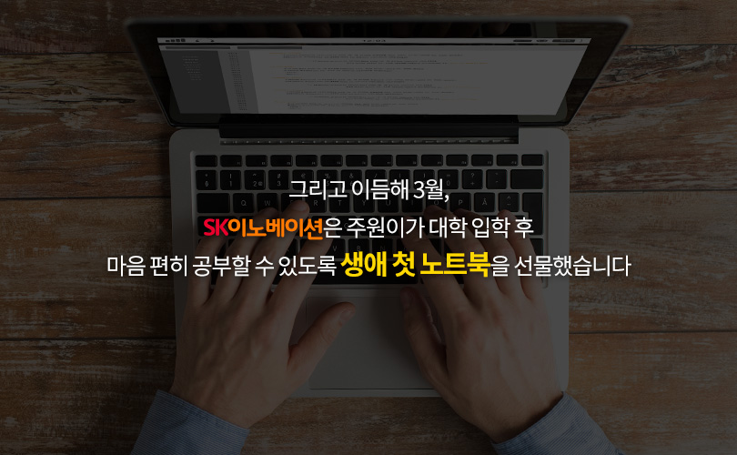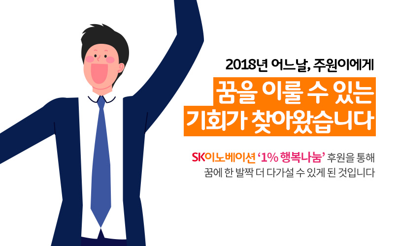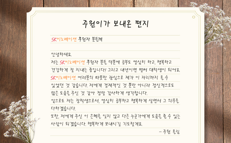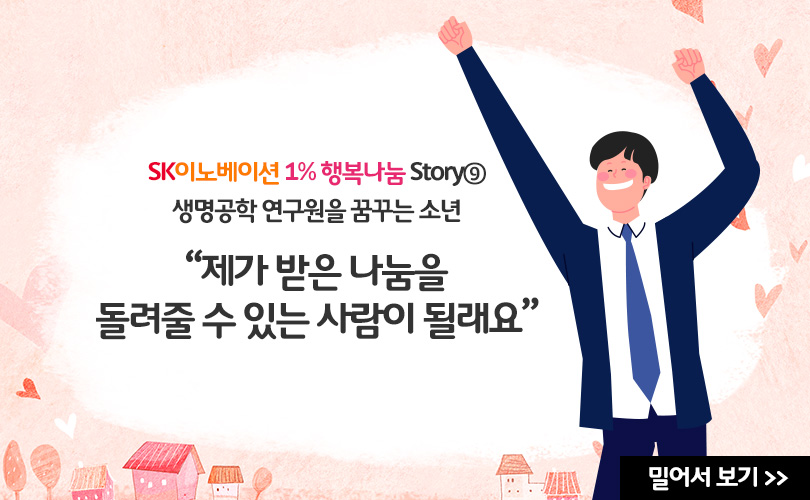 SK이노베이션의 1% 행복나눔은 주원이에게도 선물처럼 찾아왔다. SK이노베이션은 주원이가 자신의 꿈을 향해 나아갈 수 있도록 ‘1% 행복나눔’ 기금으로 주원이에게 필요한 학습교재와 영어 학원비를 지원했다. 이를 바탕으로 더욱 열심히 공부한 주원이는 마침내 2018년 12월, 서울대학교에 합격하며 생명공학 연구원이라는 꿈에 한 발짝 더 다가갈 수 있게 됐다.