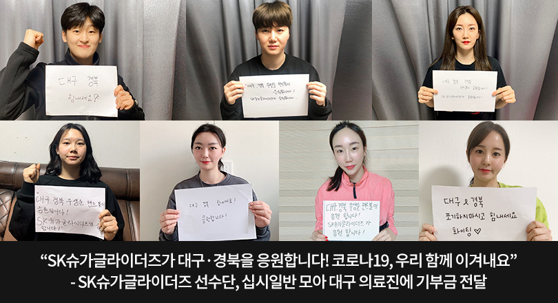 SK슈가글라이더즈 선수단은 3월 27일, 코로나19로 불철주야 고생중인 대구 의료진을 위해 십시일반 모은 기부금을 대구사회복지공동모금회에 전달했다고 밝혔다. 전달된 기부금은 의료진에게 필요한 물품을 지원하는 데 사용될 예정이다.