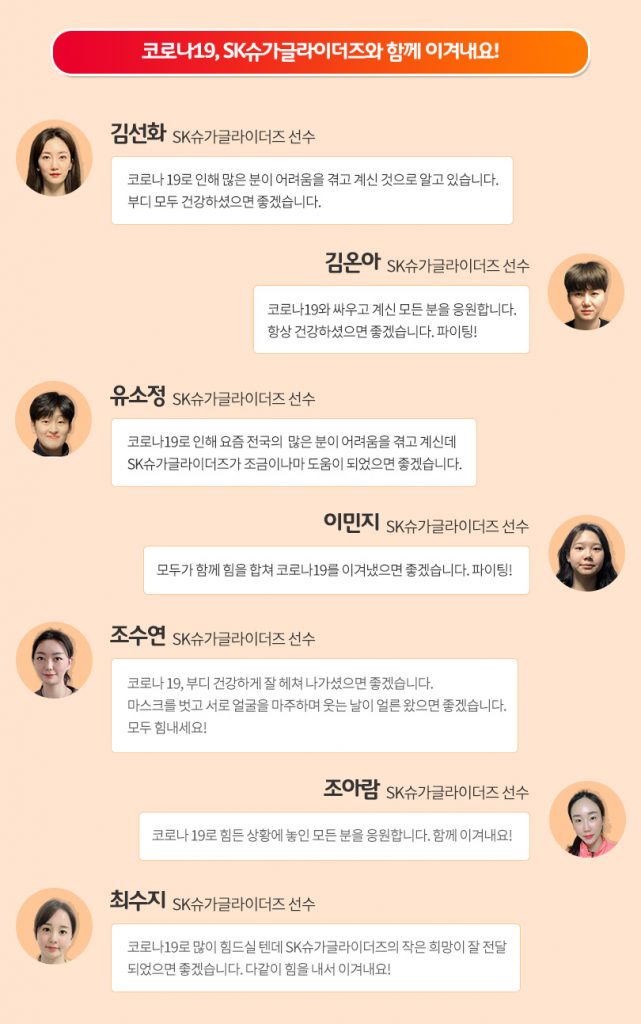 SK슈가글라이더즈 주장 조아람 선수는 “선수들이 어떻게 도움을 줄 수 있을까 의논해 십시일반 뜻을 모아 성금을 모았다”며, “팀 전체가 하나 돼 꿈을 향해 뛰는 핸드볼처럼 합심해 코로나19를 이겨내자는 마음을 전달하고 싶었다”고 기부 배경을 설명했다.