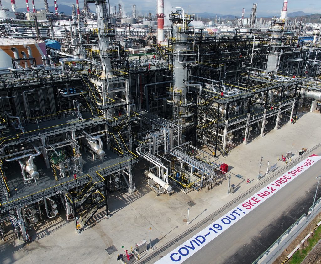 기계적준공 및 시운전을 마친 SK에너지 감압잔사유 탈황설비(VRDS) 전경, 코로나 종결을 염원하고 시운전을 마친 축하 메시지가 보인다.
