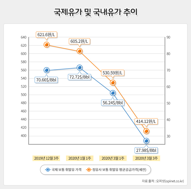 국제유가가 3월 30일(미국 현지시간), 하락세를 지속하며 지난 2002년 2월 이후 18년만의 최저치를 기록했다. 급락하는 국제유가에 따라 국내 제품 가격도 인하되는 추세다. 정유사가 주유소에 공급하는 제품 가격의 경우 세전 기준 올해 1월 첫째 주 리터당 평균 605.2원에서 3월 셋째 주 평균 414.12원으로 31.6%나 하락*했다.