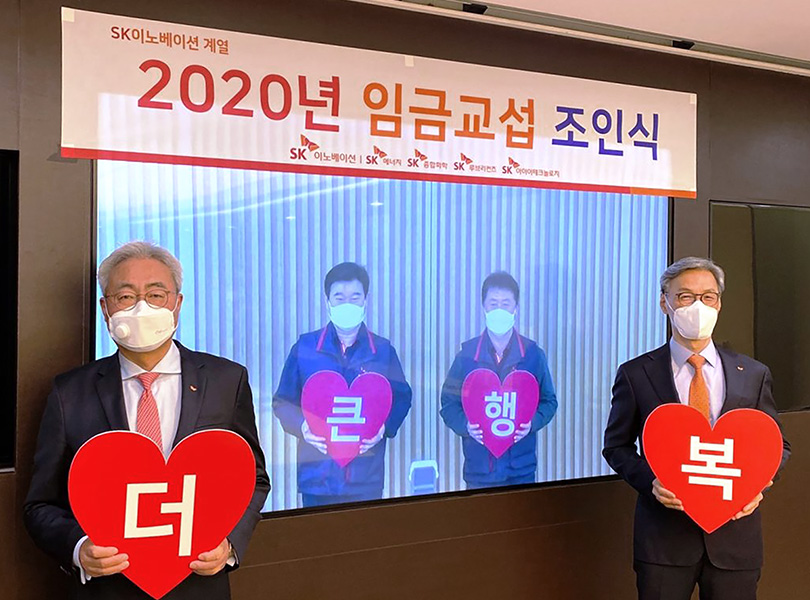 ▲ 지난 3월 3일, ‘2020년 임금교섭 조인식’을 마친 후 (왼쪽부터) SK이노베이션 김준 총괄사장, 이성훈 노동조합위원장, 김재호 노동조합부위원장, SK에너지 조경목 사장이 기념촬영을 하고 있다.