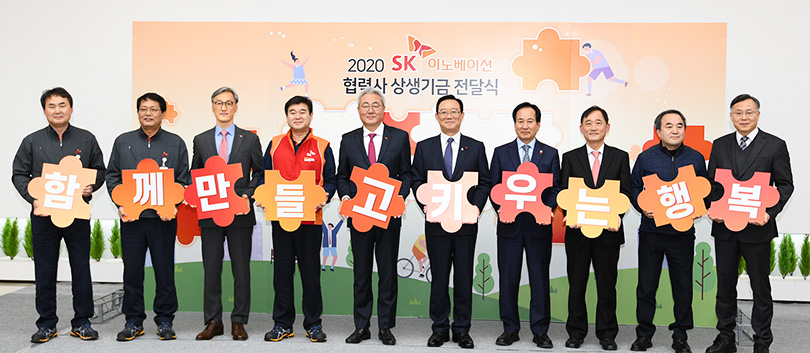 ▲ 지난 1월, ‘2020 SK이노베이션 협력사 상생기금 전달식’에 참석한 울산시 및 정부, SK이노베이션, 협력사 관계자들이 상생기금 전달 및 수여 후 기념사진을 촬영하고 있다. (왼쪽에서 세 번째부터) SK에너지 조경목 사장, SK이노베이션 이성훈 노조위원장, SK이노베이션 김준 총괄사장
