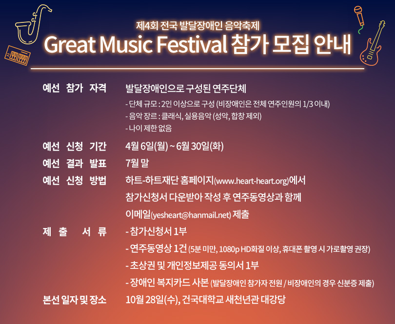 예선 접수 기간은 6월 30일(화)까지며, 하트-하트재단 공식 홈페이지(www.heart-heart.org)에서 참가신청서를 다운 받아 작성 후 이메일(yesheart@hanmail.net)로 제출하면 된다.
