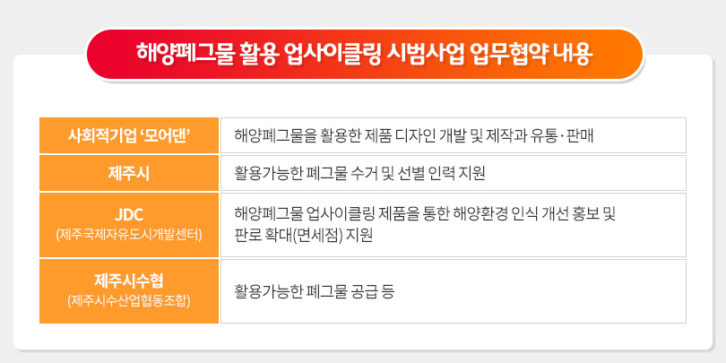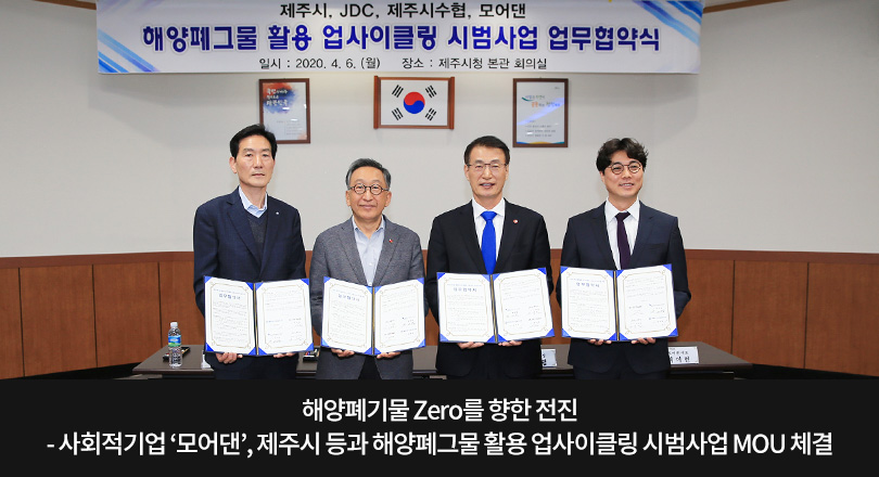 이 자리에는 고희범 제주시장, JDC 문대림 이사장, 제주시수협 김성보 조합장, 모어댄 최이현 대표가 참석했으며, 이번 업무 협약으로 모어댄을 포함한 4자는 제주 해양폐기물 문제에 적극적으로 대응하고 해양환경을 개선하는데 유기적으로 협력할 예정이다.