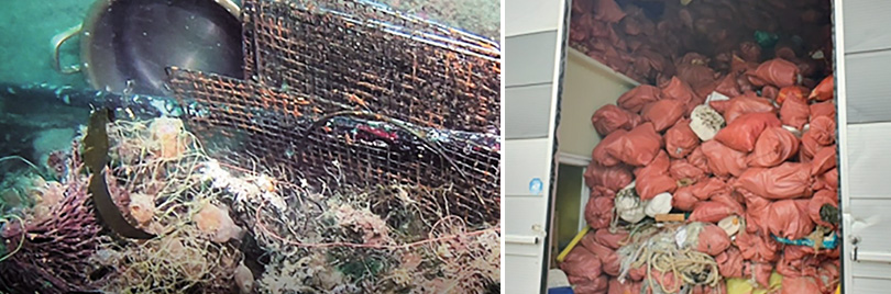 ▲ (좌)바닷 속에 버려진 폐그물 / (우)제주도에서 발생한 해양폐기물