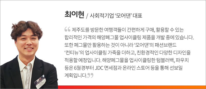 ‘모어댄’은 자동차 시트의 자투리 가죽 및 안전벨트 등으로 업사이클링 패션 제품을 생산하는 사회적기업이다. 모어댄은 해양폐그물을 업사이클링해 디자인과 실용성이 더해진 친환경 패션 제품으로 재탄생시켜 사회적가치를 키워 나가기 위해 4월 6일, 제주시-제주국제자유도시개발센터(이하 JDC)-제주시수산업협동조합(이하 제주시수협)과 함께 해양환경 개선을 위한 ‘해양폐그물 활용 업사이클링 시범사업 업무협약’을 체결했다.