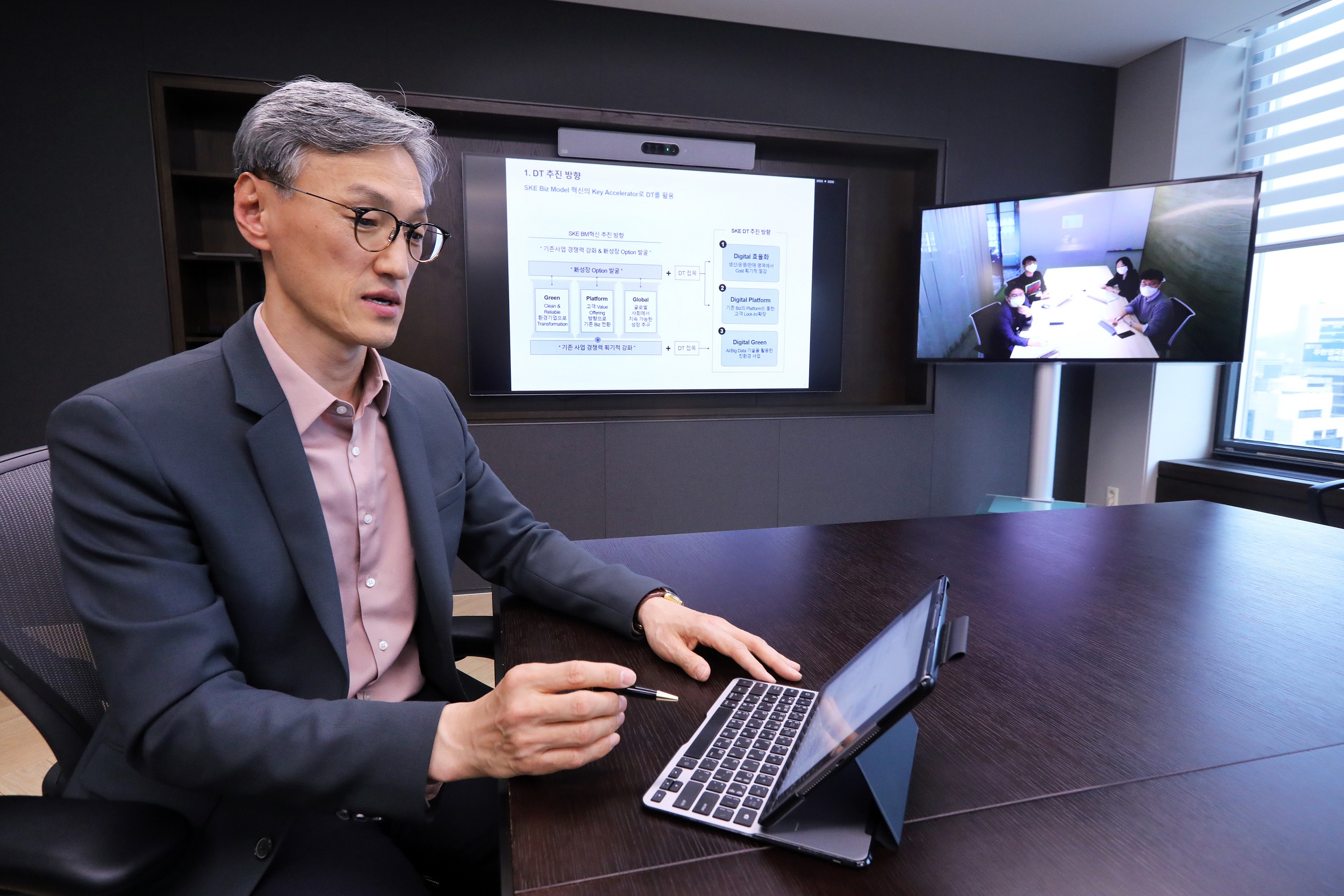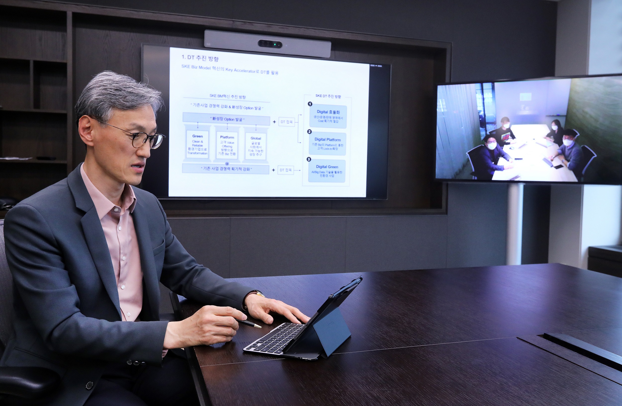 SK에너지 조경목 사장이 최근 화상회의로 진행한 ‘행복 디자인 밸리’에서 SK에너지 디지털 트랜스포메이션 추진 전략에 대해 논의하고 있다.