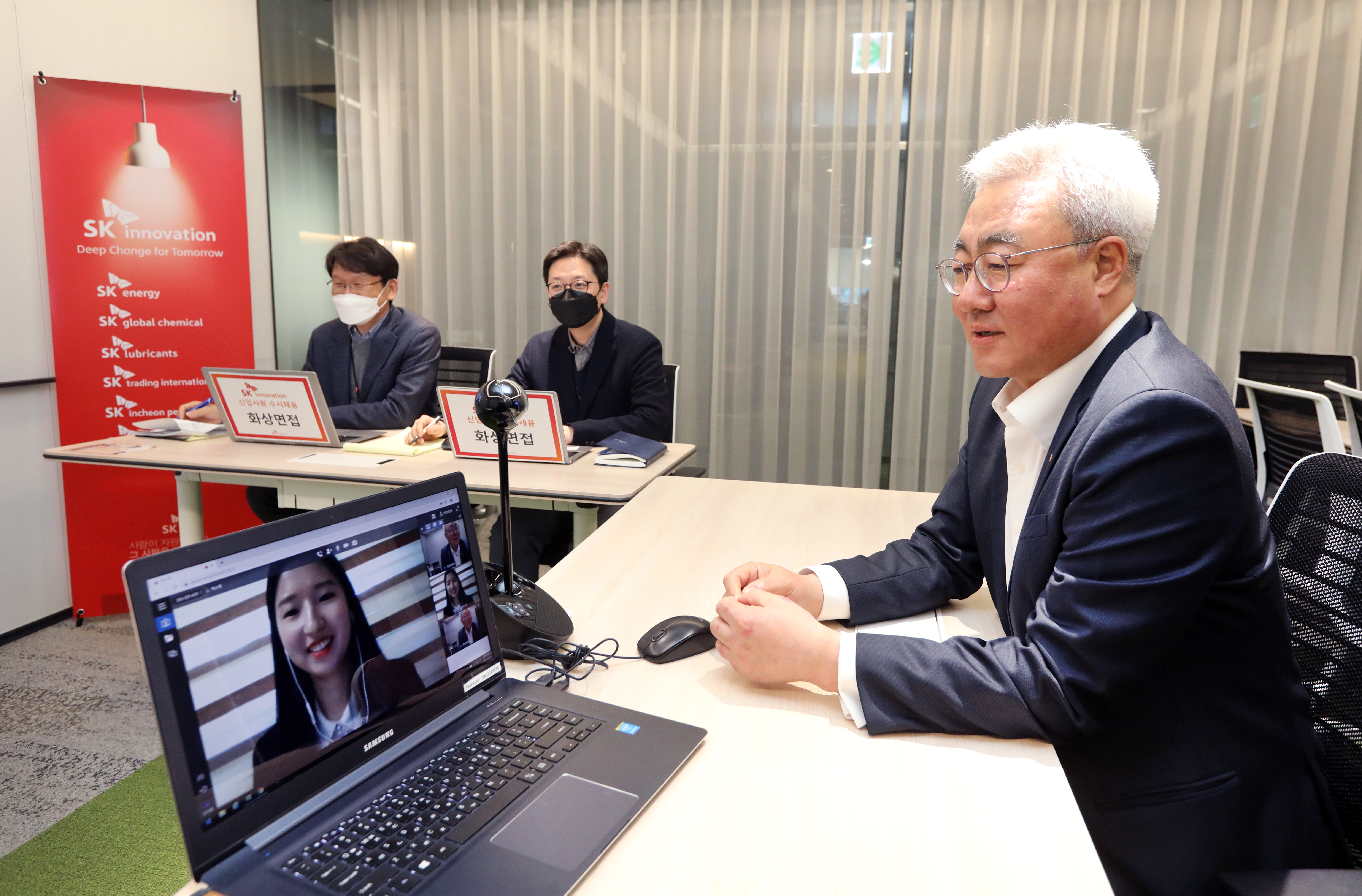 ▲ SK이노베이션 김준 총괄사장이 지난 4월 8일, 화상으로 진행된 SK이노베이션 계열 신입사원 수시채용 면접 현장에서 지원자에게 격려의 말을 건네고 있다.