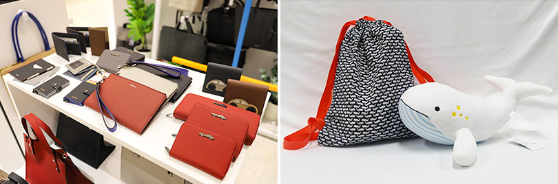 ▲ 업사이클링으로 만들어진 사회적기업 ‘모어댄’의 패션 제품(좌)과 ‘우시산’의 고래 인형 및 가방(우)