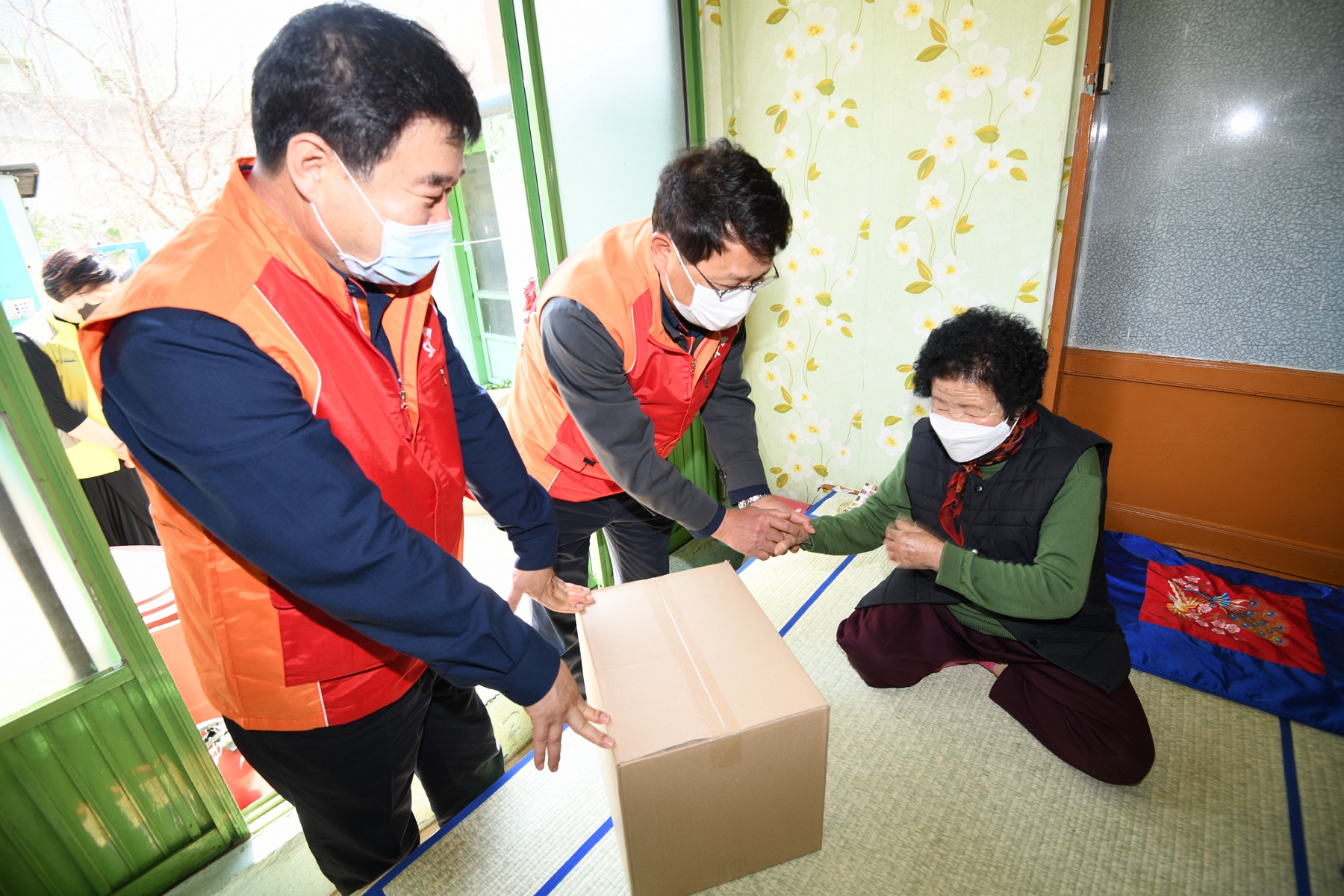 ▲ 울산CLX 박경환 총괄(가운데)과 이성훈 노동조합위원장(왼쪽)이 어르신에게 ‘SK 행복 생필품 꾸러미’를 전달하고 있다.