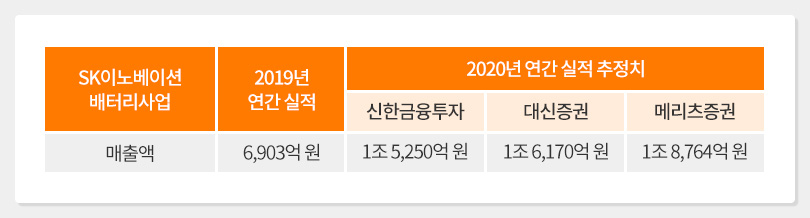각 증권사가 보고서에서 밝힌 SK이노베이션의 배터리사업 올해 매출 전망치에 따르면 신한금융투자 이진명 연구원은 1조 5,250억 원을 기록할 것으로 예상했으며, 대신증권 한상원 연구원은 1조 6,170억 원, 메리츠증권 노우호 연구원은 1조 8,764억 원을 기록할 것이라 전망했다.