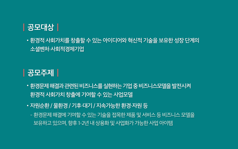 공모 주제는 ▲환경문제 해결과 관련된 비즈니스를 실현하는 기업 중 비즈니스 모델을 발전시켜 환경분야 사회적가치 창출에 기여할 수 있는 사업모델 ▲자원순환/물환경/기후·대기/지속가능한 환경·자원 등이다.