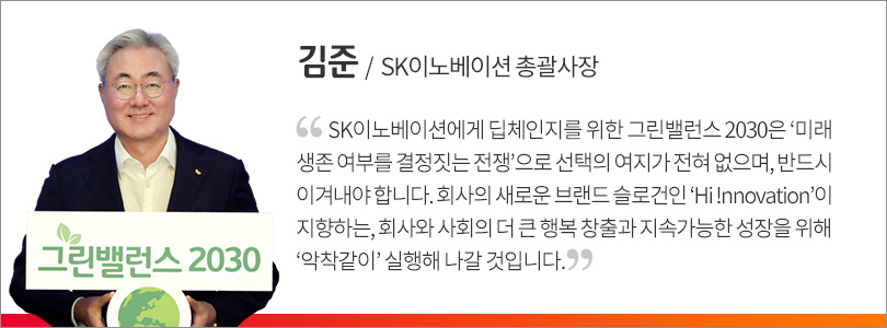 (*) 그린밸런스 2030 : SK이노베이션이 에너지∙화학 중심의 사업구조에서 발생하는 환경 부정 영향을 상쇄하기 위해 환경 긍정 영향을 창출하는 그린 비즈니스(Green Biz.)를 집중 육성해 2030년까지 환경 부정 영향을 제로(0)로, 더 나아가 플러스로 만들어 회사를 성장시키겠다는 전략이다. SK이노베이션은 지난 2019년 전사 성장전략으로 그린 밸런스 2030을 도입한 바 있다.