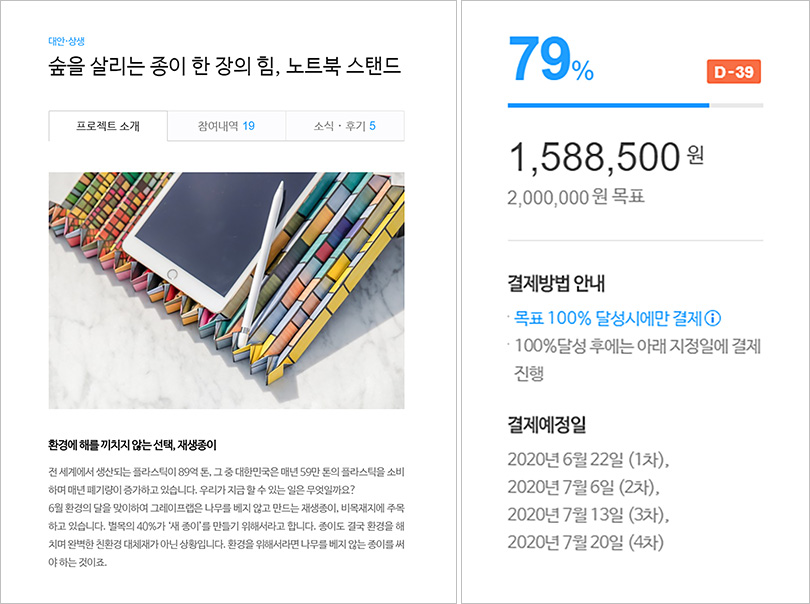 6월 환경의 달을 맞이해 사회적기업 ‘그레이프랩’은 나무를 베지 않고 만드는 재생종이, ‘비목재지’에 주목했다. 벌목의 40%가 새 종이를 만들기 위해서이며 결국, 종이도 완벽한 친환경 대체재가 아니기 때문에 환경보호를 위해선 나무를 베지 않는 종이를 써야 한다. 이에 그래이프랩은 환경에 해를 끼치지 않는 재생종이로 만든 제품을 해피빈 펀딩으로 선보였다.