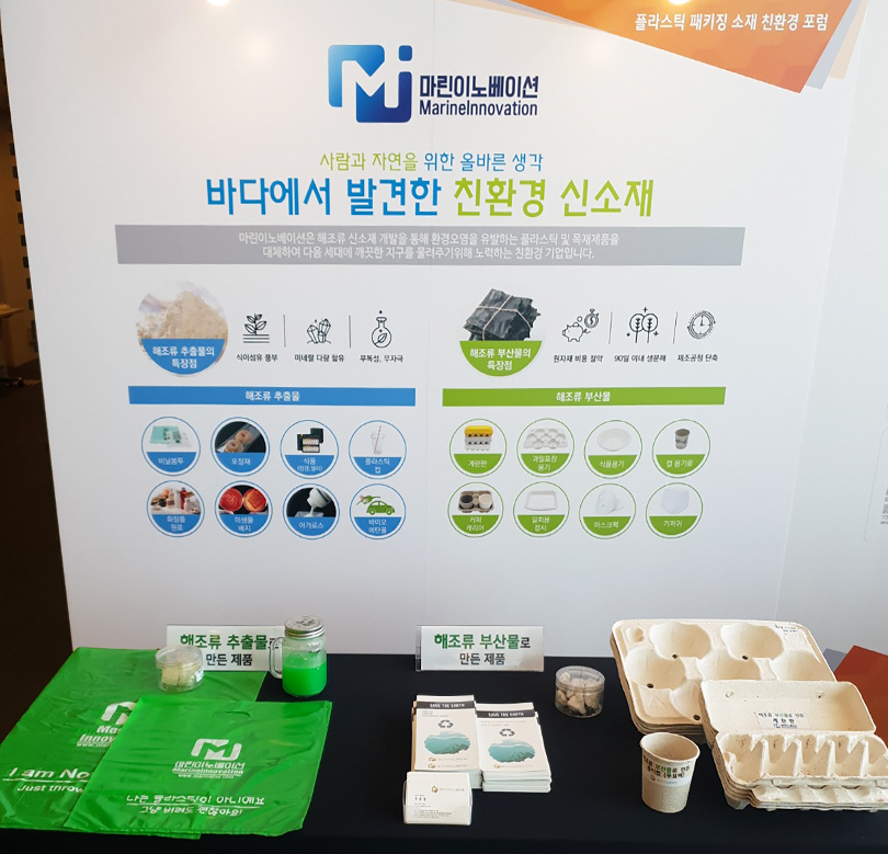 지난해 출범한 마린이노베이션은 우뭇가사리를 비롯한 해조류를 주원료로 한 100% 친환경 제조 공법을 개발해 플라스틱 등 환경오염을 유발하는 소재의 대체재를 만드는 친환경 기업이다. 종이컵과 포장용기 등으로 재생산되는 해조류 부산물은 원재료 가격 및 생산 단가가 기존 목재 대비 30% 이상 저렴하고, 90일 이내 자연 생분해 되는 친환경 소재로 환경문제 해결에 기여하고 있다.