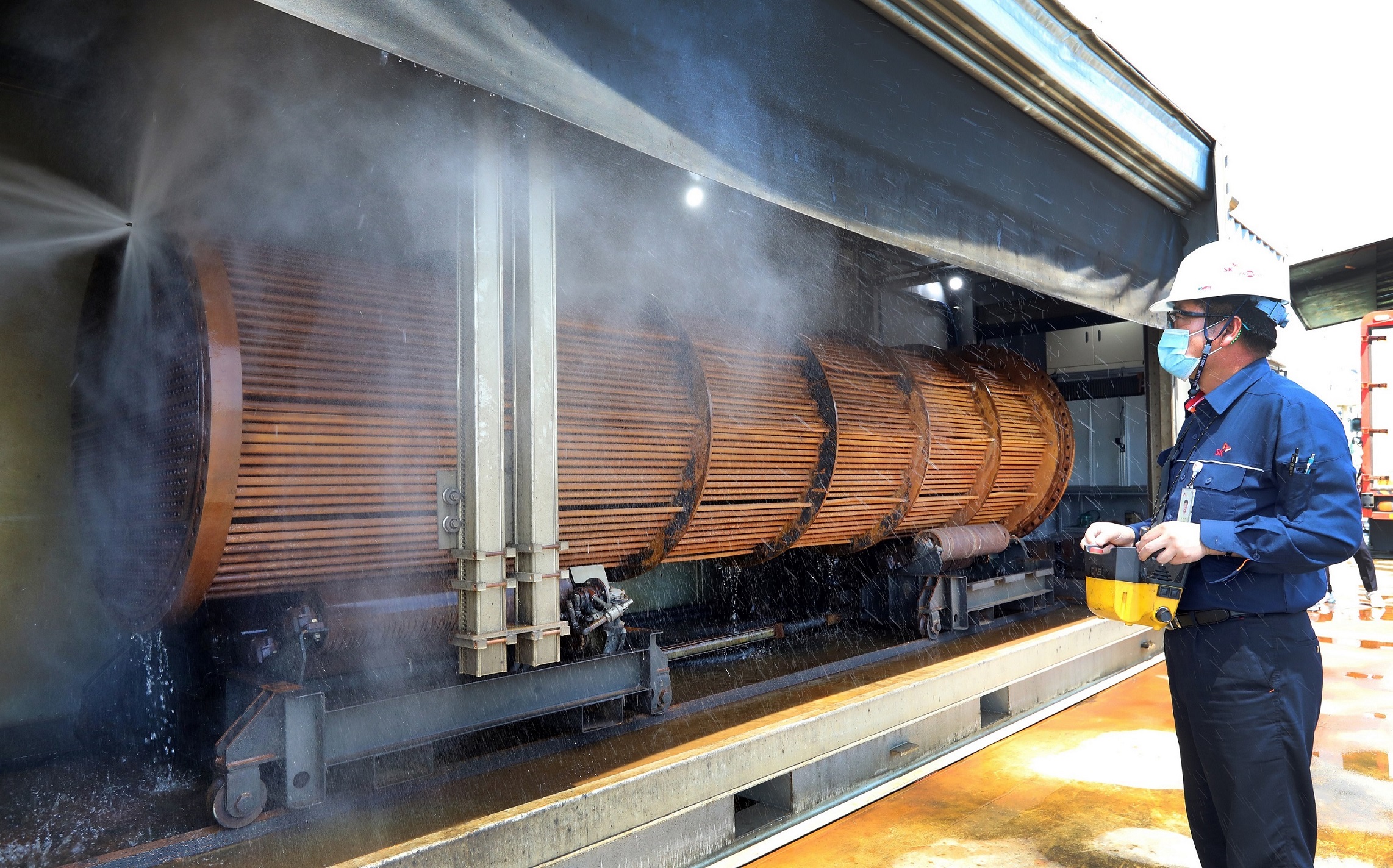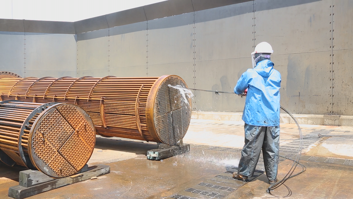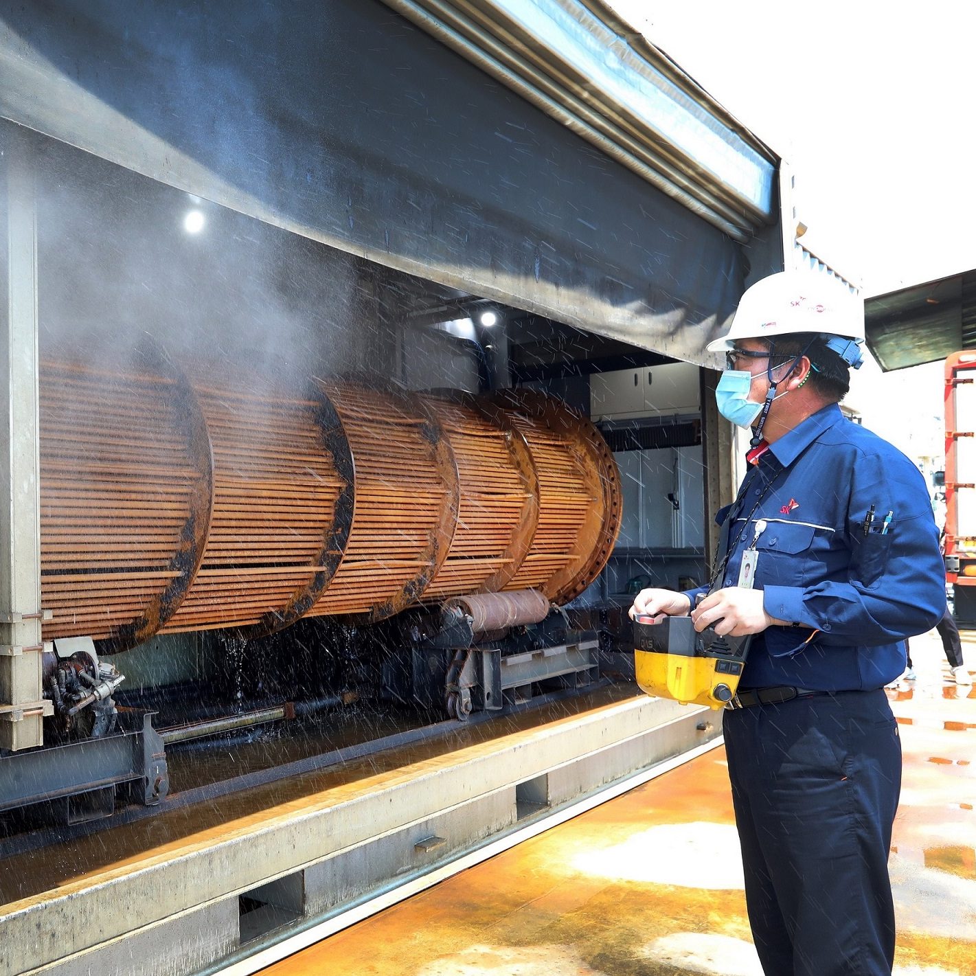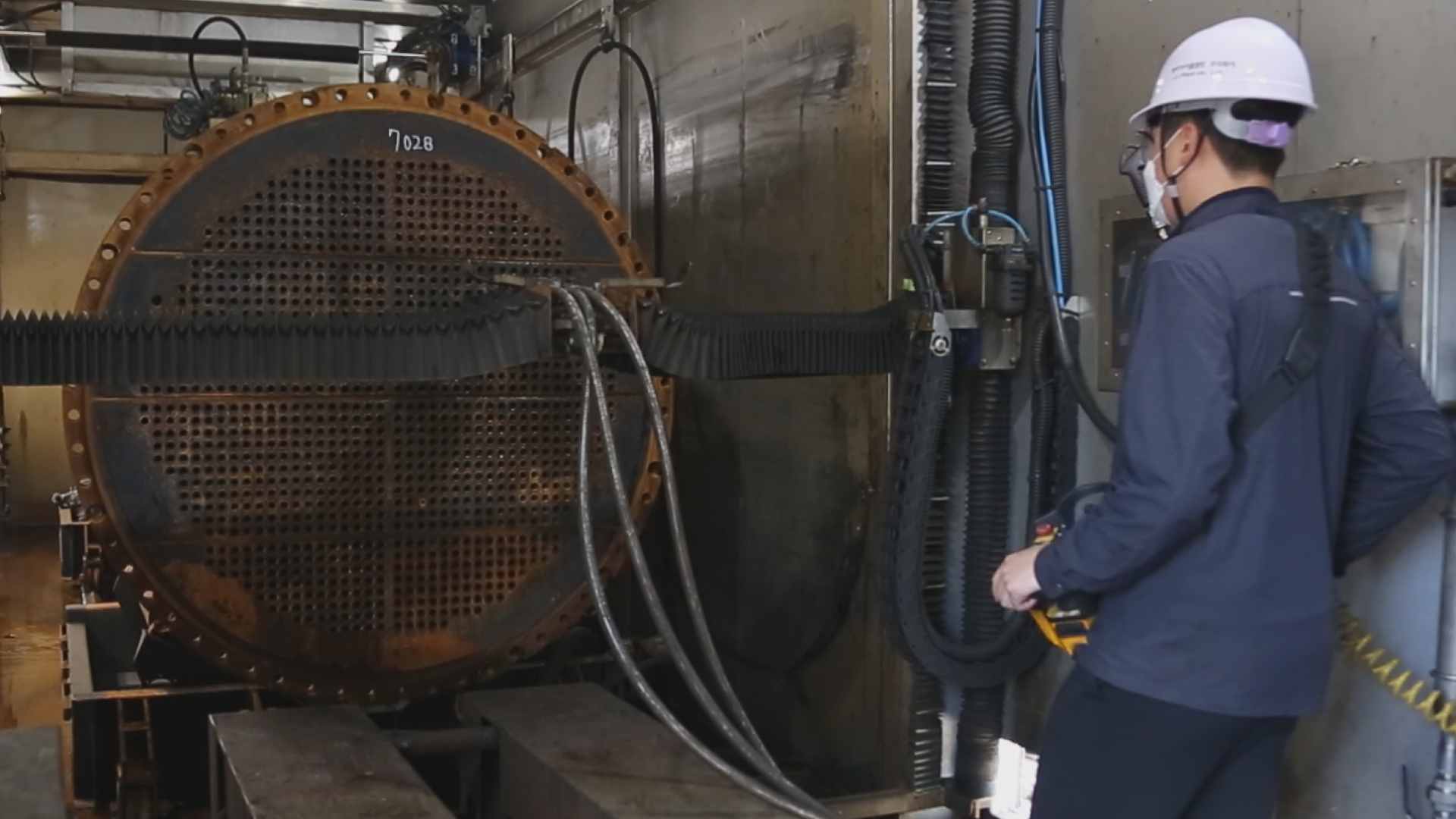열교환기는 원유 온도를 높이고 석유제품 온도는 낮춰 저장을 쉽게 해주는 정유공장의 필수 설비 중 하나로, 그간 정기보수 때마다 분리∙이송해 작업자들이 고압 호스로 수동 세척 작업을 해왔다. 따라서 많은 물 사용과 긴 작업시간이 불가피 했고, 특히 작업과정에서 안전사고 위험에 노출될 수 밖에 없는 효율이 매우 낮은 작업 중 하나다.