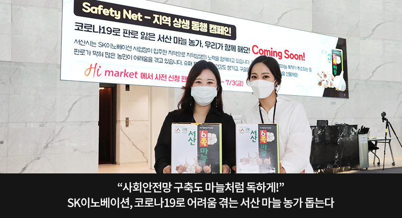 SK이노베이션은 또한 사회안전망이 지속적으로 가동될 수 있도록 다양한 방안을 마련했다. 특히, SK이노베이션은 코로나19로 매출 급감 등 어려움을 겪고 있는 사회적기업 및 소셜벤처 제품들을 지원하기 위해 시작한 ‘구성원 참여형 사회안전망 전용 몰’인 ‘하이 마켓(Hi market)’에서 6월 29일(월)부터 7월 3일(금)까지 서산 육쪽 마늘을 판매하기로 했다.
