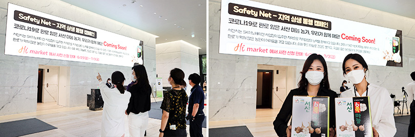 ▲ (좌) SK이노베이션 구성원들이 본사가 위치한 SK서린사옥 1층 로비의 미디어월에 뜬 ‘사회안전망 구축 캠페인’을 보고 있다. / (우) SK이노베이션 구성원들이 SK서린사옥 1층 로비에서 ‘서산 육쪽 마늘’을 들고 홍보하고 있다.