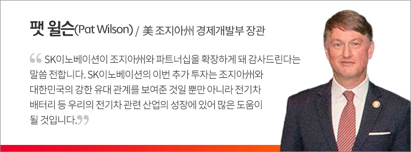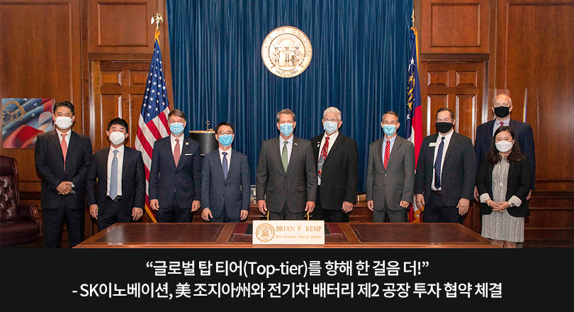 美 조지아州 ‘브라이언 켐프(Brian P. Kemp)’ 주지사는 6월 25일(현지 시간), 공식 홈페이지를 통해 “SK이노베이션이 美 조지아 주정부와 전기차 배터리 제2 공장 설립을 위한 9억 4천만 달러(한화 약 1조 1천 3백억 원) 규모의 투자 협약식을 체결했다”고 밝혔다. 또한, “SK이노베이션의 이번 투자로 6백여 개의 신규 일자리가 창출될 것”이라고 강조했다. 이로써 SK이노베이션은 기존 제1 공장의 2천 명 고용 효과까지 합쳐 2천 6백여 개의 일자리를 창출하게 되는 것이다.