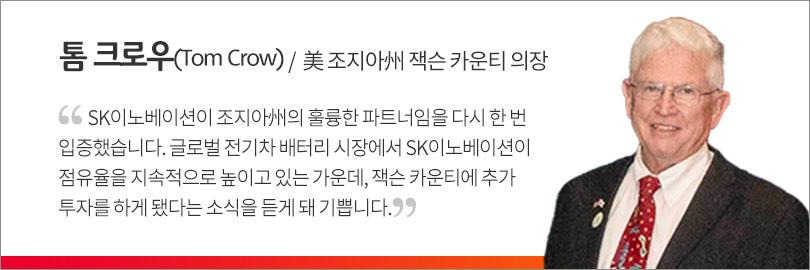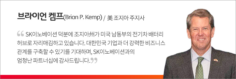 조지아 주청사에서 열린 이날 행사에는 美 조지아州 ‘브라이언 켐프’ 주지사, 조지아州 경제개발부 ‘팻 윌슨(Pat Wilson)’ 장관, 조지아州 ‘톰 크로우(Tom Crow)’ 잭슨 카운티 의장, SK Battery America 황준호 대표 등 관계자가 참석했다.
