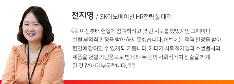 또한, 헌혈을 마친 구성원들에게는 코로나19 장기화 등으로 인해 어려움을 겪고 있는 사회적기업 및 소셜벤처의 제품들이 헌혈 기념품으로 제공돼 그 의미를 더했다.