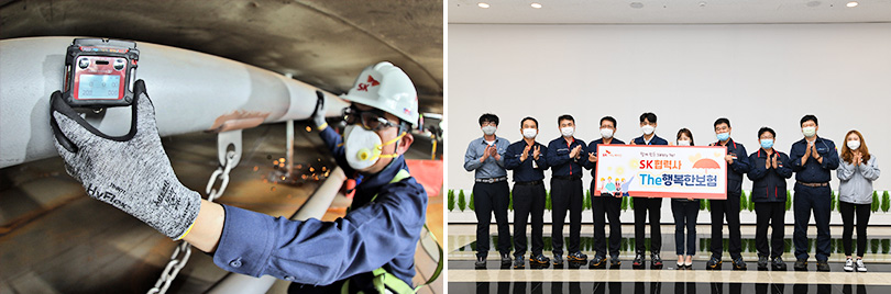▲ (좌)SK에너지가 개발한 ‘밀폐공간 가스 감지 시스템’과 (우) 협력사 구성원에게 단체보험 패키지를 제공한 SK이노베이션 울산Complex