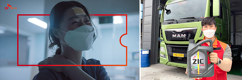 ▲ (좌)SK에너지의 ‘SK오일로패스 시즌2’ 캠페인 영상 캡처와 (우)화물차주들에게 이벤트를 통해 무상 제공하는 SK ZIC 윤활유 ‘X7000 CK-4 10W-40’