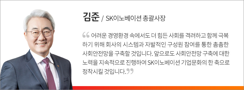SK이노베이션은 지속가능성과 진정성이라는 원칙으로 회사 시스템과 인프라를 활용해 다 방면의 사회안전망 구축을 위해 최선을 다할 것이다.