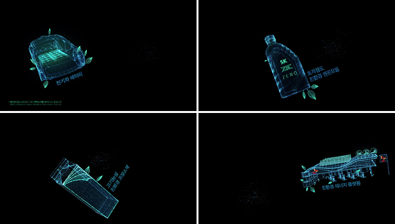 SK이노베이션의 그린밸런스 2030 사업 실체들인 전기차 배터리, 친환경 엔진오일 SK ZIC Zero, 고기능성 친환경 포장소재, 친환경 에너지 플랫폼 등은 검은색 바탕 위에 선으로만 표현돼 잔잔한 BGM과 함께 몰입감을 더욱 높여준다.