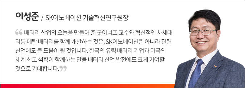SK이노베이션은 굿이너프 교수와 함께 차세대 배터리 중 하나로 높은 평가를 받고 있는 리튬 메탈(Lithium-Metal) 배터리를 구현하기 위한 ‘고체 전해질’ 연구를 진행한다.