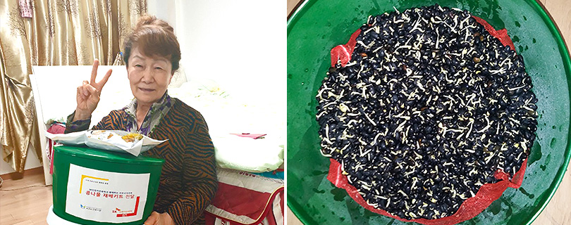 ▲ (좌) 지난 4월, SK인천석유화학이 전달한 콩나물 재배키트를 받은 어르신