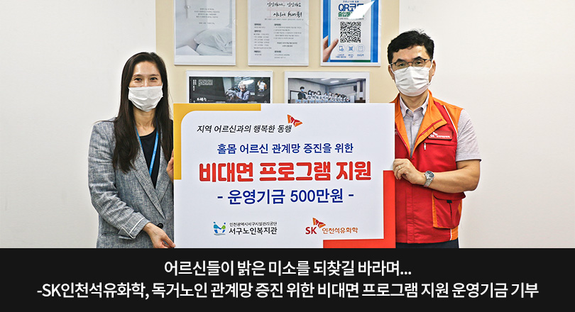 SK이노베이션의 자회사 SK인천석유화학은 8월 4일, 지역 내 독거노인 관계망 증진과 코로나19 장기화에 따른 독거노인들의 우울함 감소 등을 돕고자 비대면 프로그램 운영기금 5백만 원을 인천서구노인복지관에 전달했다.