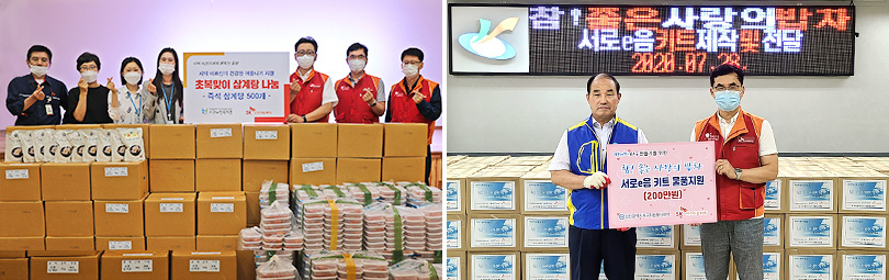 ▲ SK인천석유화학이 지난 7월 14일과 28일에 진행한 ‘초복맞이 삼계탕 나눔’ 행사(좌측)과 ‘참! 좋은 사랑의 밥차 서로e음 키트’ 전달식(우측)
