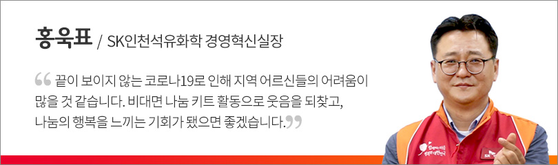SK인천석유화학이 전달한 기금은 인천서구노인복지관을 통해 지역 내 독거노인들에게 부채 만들기, 친환경 에코백 만들기, 느타리버섯재배 등 코로나 블루(Corona blue) 극복을 위한 비대면 나눔 키트로 전달될 예정이다. 또한, 나눔 키트를 전달받은 독거노인들은 키트 한 개를 추가로 더 만들어 코로나19 확산 방지에 힘쓰고 있는 지역 의료진과 주변의 이웃 및 동료들에게 나눔을 실천할 수 있도록 진행할 계획이다. SK인천석유화학 구성원들도 이 활동에 동참해 나눔의 손길을 보태게 된다.