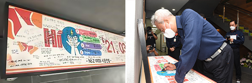 이날 김준 총괄사장은 울산CLX No.2 VRDS 조정실에 걸려 있는 ‘아주 특별한’ 플래카드에 서명하며 그간 안정조업에 힘써온 구성원들의 노고를 치하했다. 바로 ‘No.2 VRDS 시운전 Unit(現 HOU생산3 Unit)’의 다짐과 구성원들의 응원 메시지 등이 빼곡하게 적힌 ‘Hi-FIVE 21. 03!’ 플래카드다.