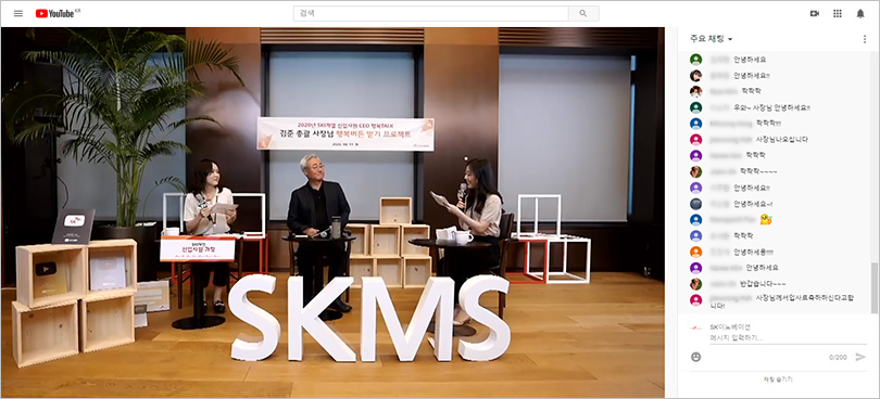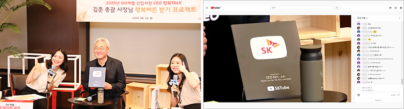 이번 ‘CEO와의 대화’ 행사의 컨셉은 바로 ‘슼튜브 스트리밍’! 그간 신입사원들이 경험한 언택트 방식의 채용, 오리엔테이션(OT), 연수 과정 등에서 아이디어를 얻어 유튜브를 활용한 온라인 라이브 형태를 선택한 것이다. 라이브 방송의 컨셉 또한 유튜브를 적극 이용하는 밀레니얼 세대답다. 인기 유튜버들이 받는 ‘유튜브 버튼’에서 착안해 김준 총괄사장이 ‘SK행복버튼’을 받는 것을 목표로, 신입사원들의 질문에 대한 김준 총괄사장의 답변과 신입사원들의 참여에 따른 점수에 맞춰 단계별로 버튼이 부여되는 방식이다. 이를 위해 신입사원들은 행사 내내 채팅을 통해 적극적으로 소통하며 김준 총괄사장의 미션 달성을 돕는 한편, 참여 점수를 높이기 위해 좋아요를 누르는 등 실시간으로 함께하는 모습을 보였다.
