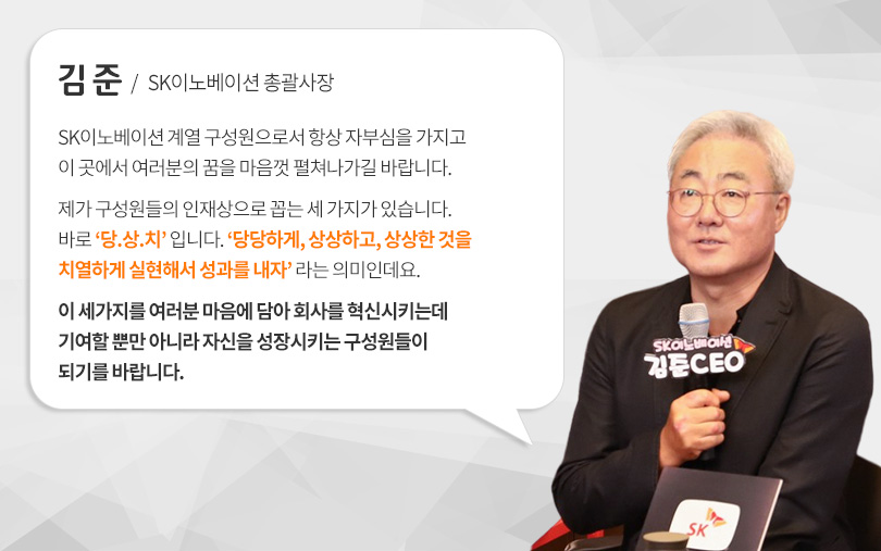 다음 순서인 ‘SK이노베이션 계열 신입사원이 CEO에게 묻다’ 섹션은 첫 번째 파트인 ‘행복과 성장,’ 두 번째 파트인 ‘소통’을 주제로, 신입사원들이 직접 선정한 문항에 김준 총괄사장이 답하는 토크쇼 형식으로 진행됐다.
