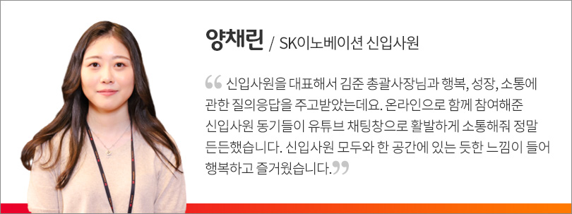 앞서 신입사원들은 각 2주씩 총 4주간 진행된 SK그룹 및 SK이노베이션 계열 신입사원 연수 과정을 거친 후 이번 ‘CEO와의 대화’를 끝으로 SK이노베이션人으로서의 첫 걸음을 내딛게 된다. 연수 과정의 마지막을 장식하는 ‘CEO와의 대화’는 SK이노베이션 계열 CEO들과 패기 가득한 신입사원 간 격의 없는 소통이 이뤄지는 시간으로, 올해는 코로나19가 지속되는 상황을 고려해 지난 연수 과정은 물론 이번 ‘CEO와의 대화’ 역시 언택트(Untact) 방식으로 진행됐다.