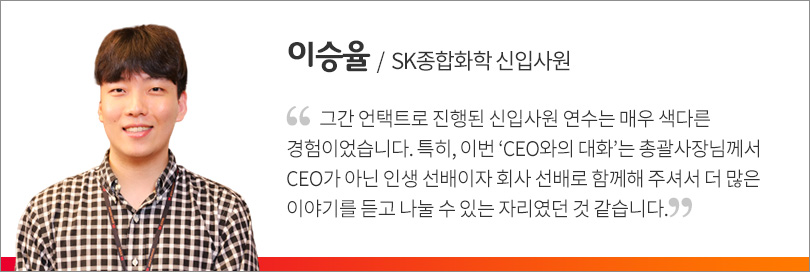 2020년 상반기 SK이노베이션 계열 신입사원 연수 과정의 피날레인 ‘CEO와의 대화’가 8월 11일, SK이노베이션 본사가 위치한 SK서린사옥(종로구 소재)과 유튜브에서 온⁄오프라인으로 동시에 진행됐다.