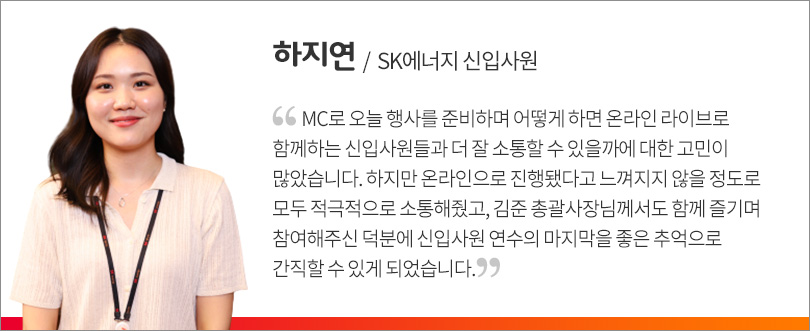 이날 행사는 지난 7월 22일부터 31일까지 8일간 진행(주말 제외)된 SK이노베이션 계열 신입사원 연수를 담은 짧은 영상을 시청하는 것으로 시작됐다. 신입사원들의 다양한 교육 활동과 함께 그들의 부모님들이 보내온 영상 편지도 함께 송출됐다. 마음을 울리는 부모님들의 응원에 신입사원들은 온라인 채팅창을 통해 ‘감동이다’, ‘취업 준비로 인해 부모님께서도 너무 고생하셨다’ 등 다양한 소감을 남겼다.