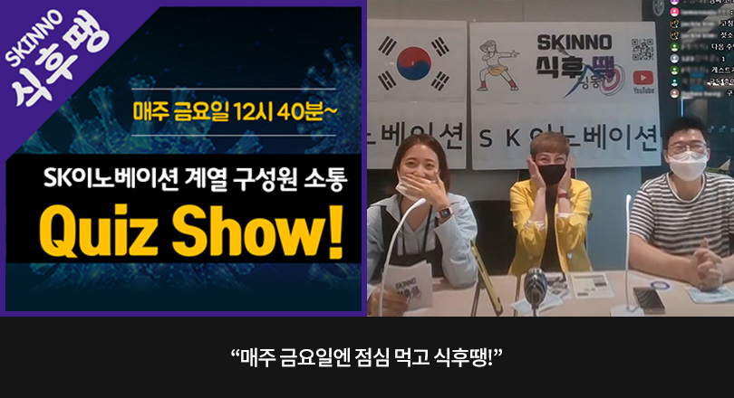 코로나19 장기화로 인해 언택트(Untact, 비대면)가 최대의 화두가 된 요즘! SK이노베이션이 구성원 퀴즈쇼인 ’SKINNO 식후땡’으로 SK이노베이션 계열 全 구성원과 소통에 나섰다. 지난 7월 17일부터 매주 금요일 오후 12시 40분에 진행되는 ’SKINNO 식후땡’은 구성원들이 유튜브 라이브 방송에 직접 접속해 온라인 채팅 및 전화 등으로 다양한 퀴즈를 풀고, 맞힌 구성원에게는 치킨 등 선물을 제공하는 SK이노베이션의 신개념 소통 프로그램이다. 점심을 먹은 뒤 가볍게 즐기자는 의미에서 ‘식후땡’이라고 이름 붙인 이 프로그램은 진행자와 게스트 모두 구성원으로 이뤄졌다.