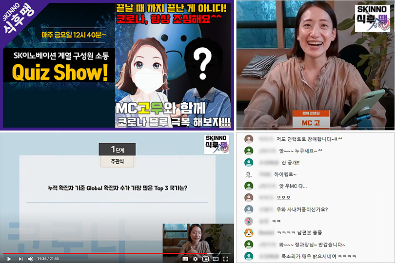 코로나 블루(Corona Blue)를 함께 극복하자는 차원에서 진행된 지난 8월 21일 자 ‘SKINNO 식후땡’에선 서울, 울산 등 각 사업장의 구성원들과 전화 연결을 통해 상식, 넌센스 및 회사 관련 퀴즈를 풀고 신변잡기를 함께 나누며 즐거운 소통 시간을 이어나갔다. 구성원들은 “저도 언택트로 참여합니다”, “유쾌한 시간이었다” 등 채팅 창에 실시간으로 댓글을 남기며 방송에 참여했다.