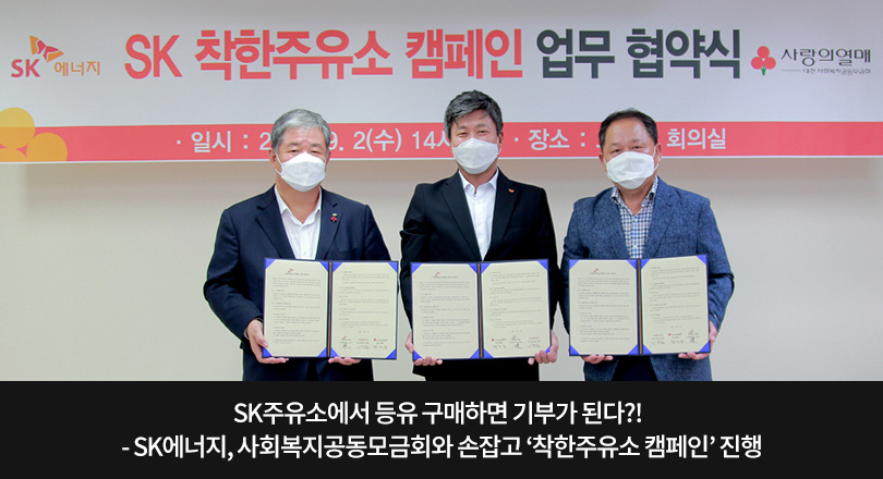 SK에너지는 지난 9월 2일, 대전사회복지공동모금회 사무실에서 충청·호남·경남 지역에 위치한 SK주유소(자영주유소) 및 사회복지공동모금회와 함께 ‘SK 착한주유소 캠페인 운영을 위한 업무 협약식’을 개최했다. 이 자리에는 SK에너지 이영철 남부사업부장과 서산제일주유소 김경수 대표, 대전사회복지공동모금회 정태희 회장 등 행사 관계자가 참석했다.